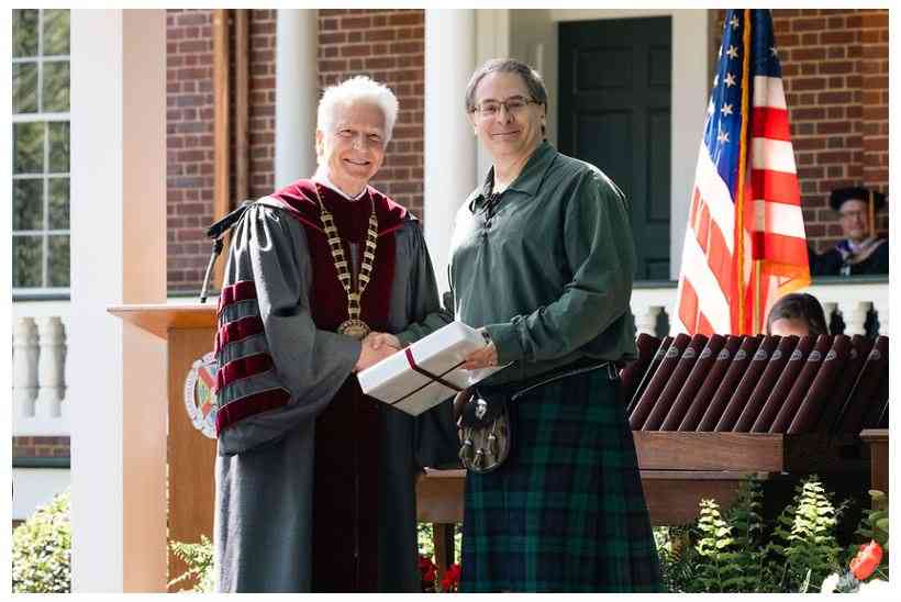 At right: Hight being presented the Edward Crawley Award for service to the College by President Stimpert, May 2025. Hight played the pipes (with Dunn, Cheyne, and a student J. Covington) for the recessional of the graduation ceremony.